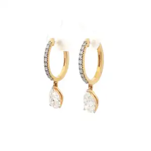 Elevate your style with these exquisite drop earrings, crafted in radiant 18k yellow gold. Each earring features small diamonds paired with a mesmerizing pear-shaped diamond, meticulously cut with a ...