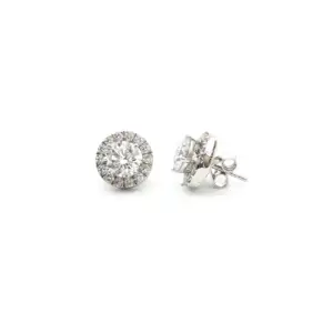 Elevate your everyday elegance with these 2.89 carat classic stud earrings. Crafted in 18k white gold, each earring showcases a brilliant round cut diamond, secured with a halo of ...