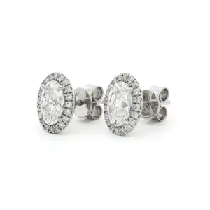 Indulge in the subtle sophistication of these exquisite 2.28 carat stud earrings. Crafted in luminous 18k white gold, each earring features a mesmerizing oval cut diamond surrounded with a ...