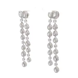 Elevate your style with these exquisite 18k white gold dangle earrings. Each earring features a meticulously arranged cascade of brilliant-cut pear and oval diamonds. The white gold setting enhances ...