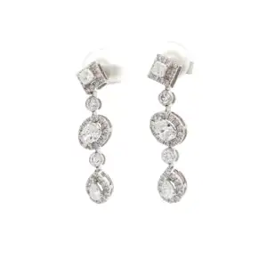 Elevate your style with these exquisite 18k white gold drop earrings, showcasing brilliant-cut pear diamonds, oval diamonds and princess cut diamonds, surrounded with a halo of diamonds. These earrings ...