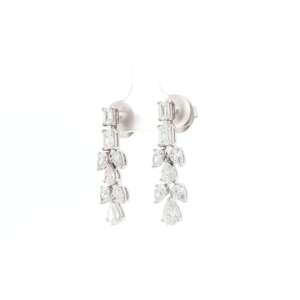 These elegant white gold drop earrings feature a vertical arrangement of emerald-cut and pear-brilliant diamonds. Each earring displays two step-cut emerald diamonds followed by a graceful cluster of pear-shaped ...