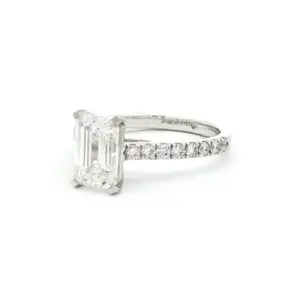 Indulge in the timeless elegance of this 2.47 carat ring, showcasing a meticulously step-cut emerald shape diamond set in a high setting half eternity band. Its classic design and ...