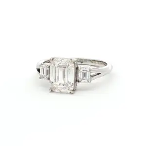 Exquisite 2.44 carat trilogy ring, crafted in 18k white gold. A captivating emerald-cut diamond takes center stage, its step-cut facets promising a mesmerizing play of light. Flanking this spectacular ...
