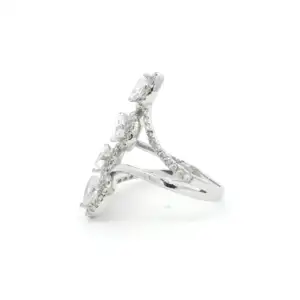 Embrace luxury with this exquisite multistone ring, crafted in lustrous 18k white gold. A stunning floral arrangement of pear cut diamond takes center stage, followers by a trail of ...