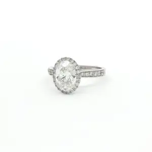 Exquisite 2.63 carat ring featuring a brilliant oval cut diamond, surrounded by a halo, set in a half eternity band. This ring boasts a classic design with a modern ...