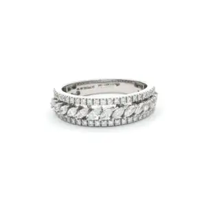 Experience timeless elegance with this exquisite 18k white gold band ring. Adorned with marquise and round cut diamonds showcasing brilliant cutting style, this ring exudes sophistication and charm. Its ...