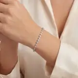 Adorn your wrist with this chic bezel diamond bracelet, crafted in 18k white gold for a lustrous finish. The design features a series of brilliant round cut diamonds, each set to maximize light reflection, offering a subtle yet elegant sparkle for everyday wear.