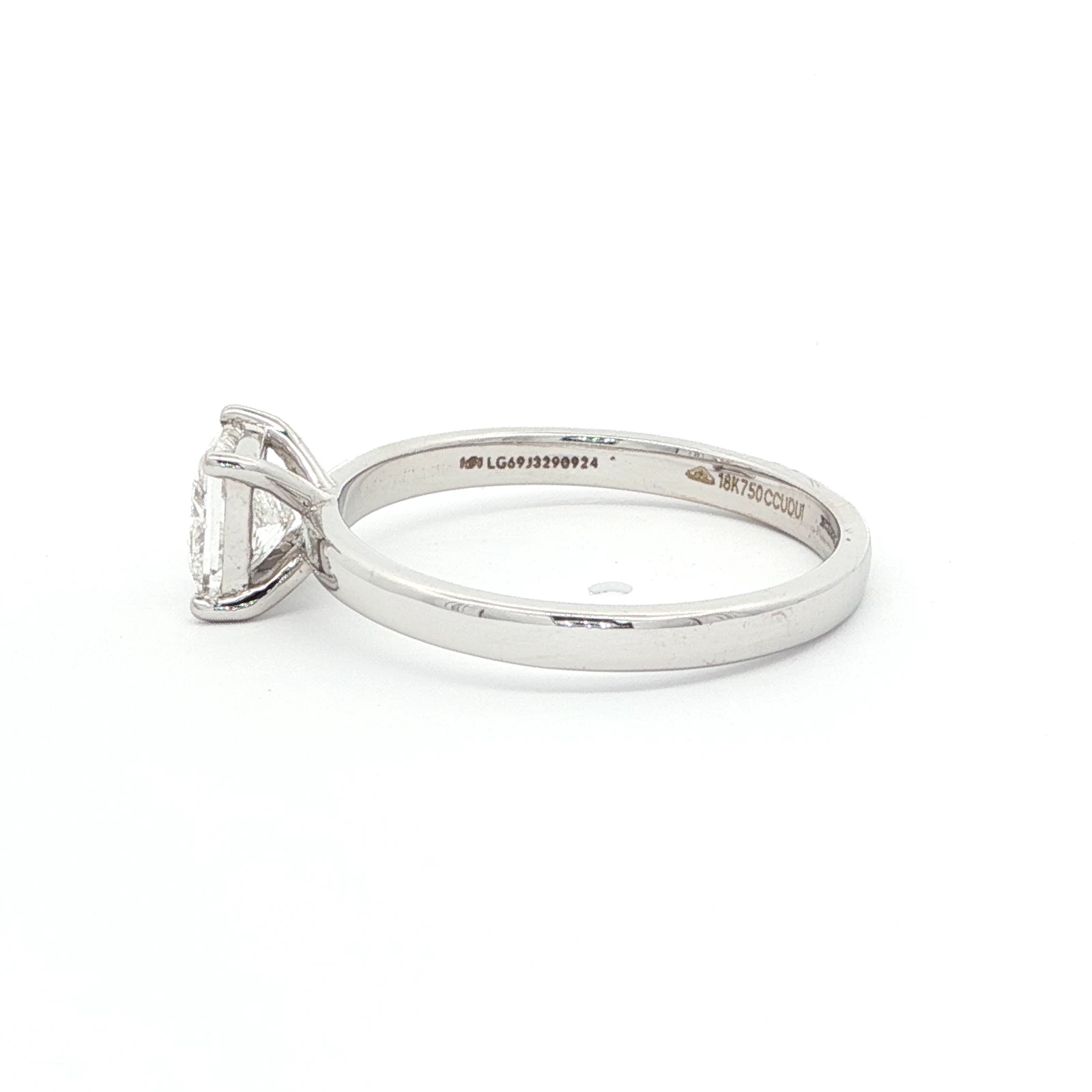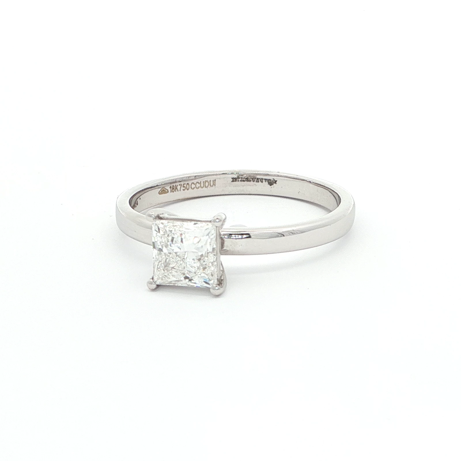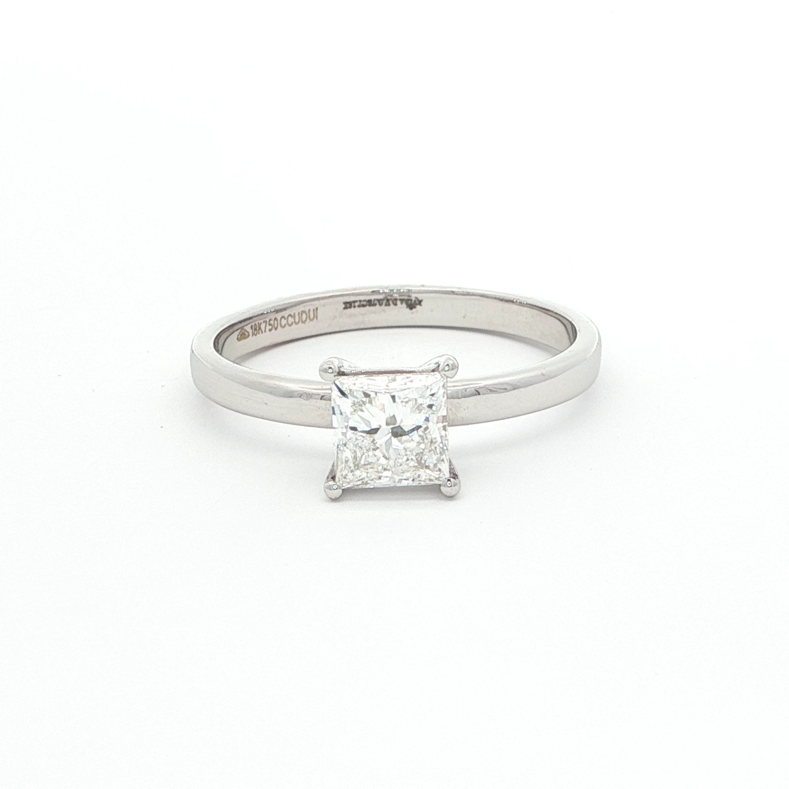 Exquisite solitaire ring crafted in 18k white gold, featuring a stunning 0.78 carat princess cut diamond. The brilliant cutting style enhances the diamond’s natural sparkle. This timeless piece exudes elegance and sophistication, perfect for celebrating life’s most precious moments. The classic design of this ring showcases the diamond, creating a captivating and unforgettable symbol of love.