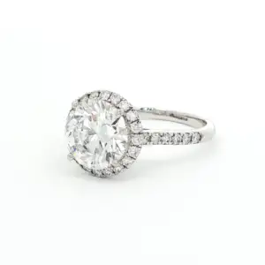 Elegant 3.66 carat ring featuring a round brilliant cut diamond at the center, surrounded with a halo, and set in a half eternity band. The diamond is securely set in a classic prong setting that enhances its fire and brilliance. The ring’s band is crafted from polished 18k white gold, offering a sleek and sophisticated aesthetic. This timeless design is perfect for celebrating a special commitment.