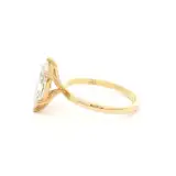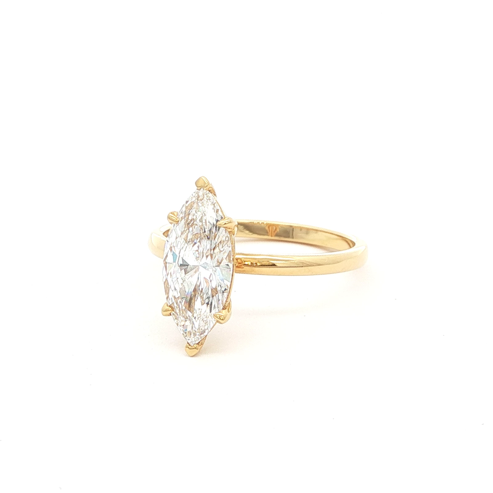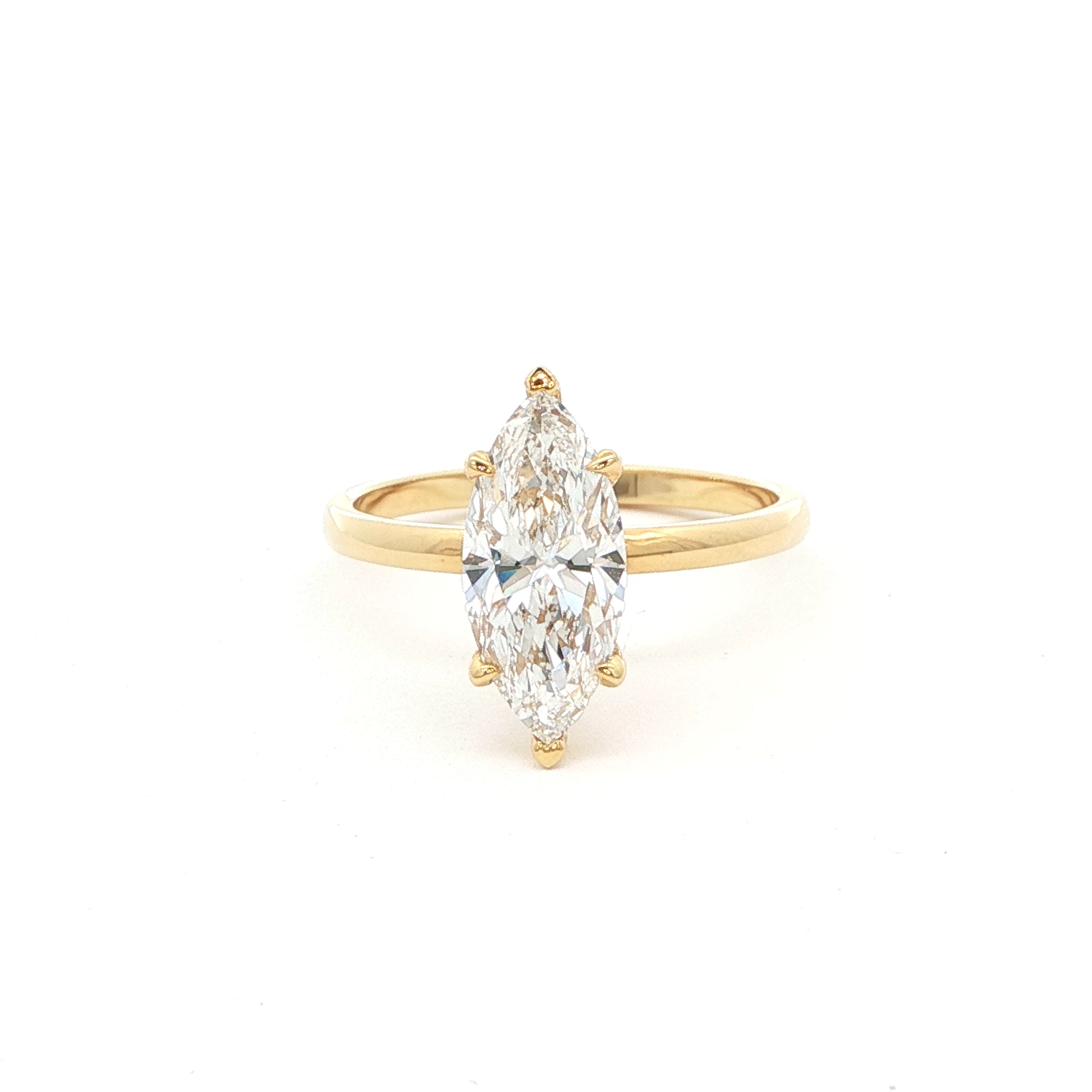 Exquisite solitaire ring featuring a 1.50 carat marquise cut diamond set in a lustrous 18k yellow gold band. The brilliant cutting style of the diamond enhances its sparkle and fire, creating a captivating display of light. A timeless design, perfect for celebrating life’s special moments with elegance and grace.