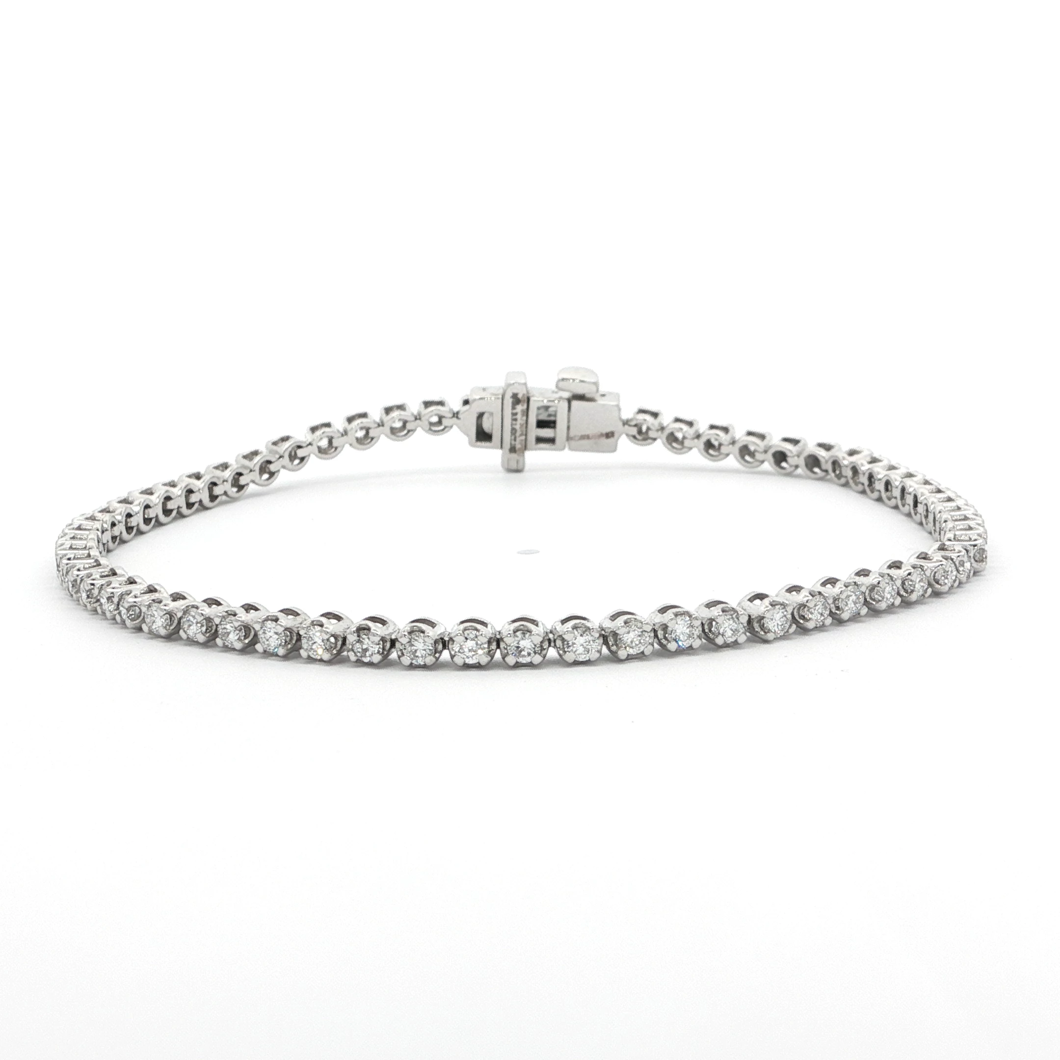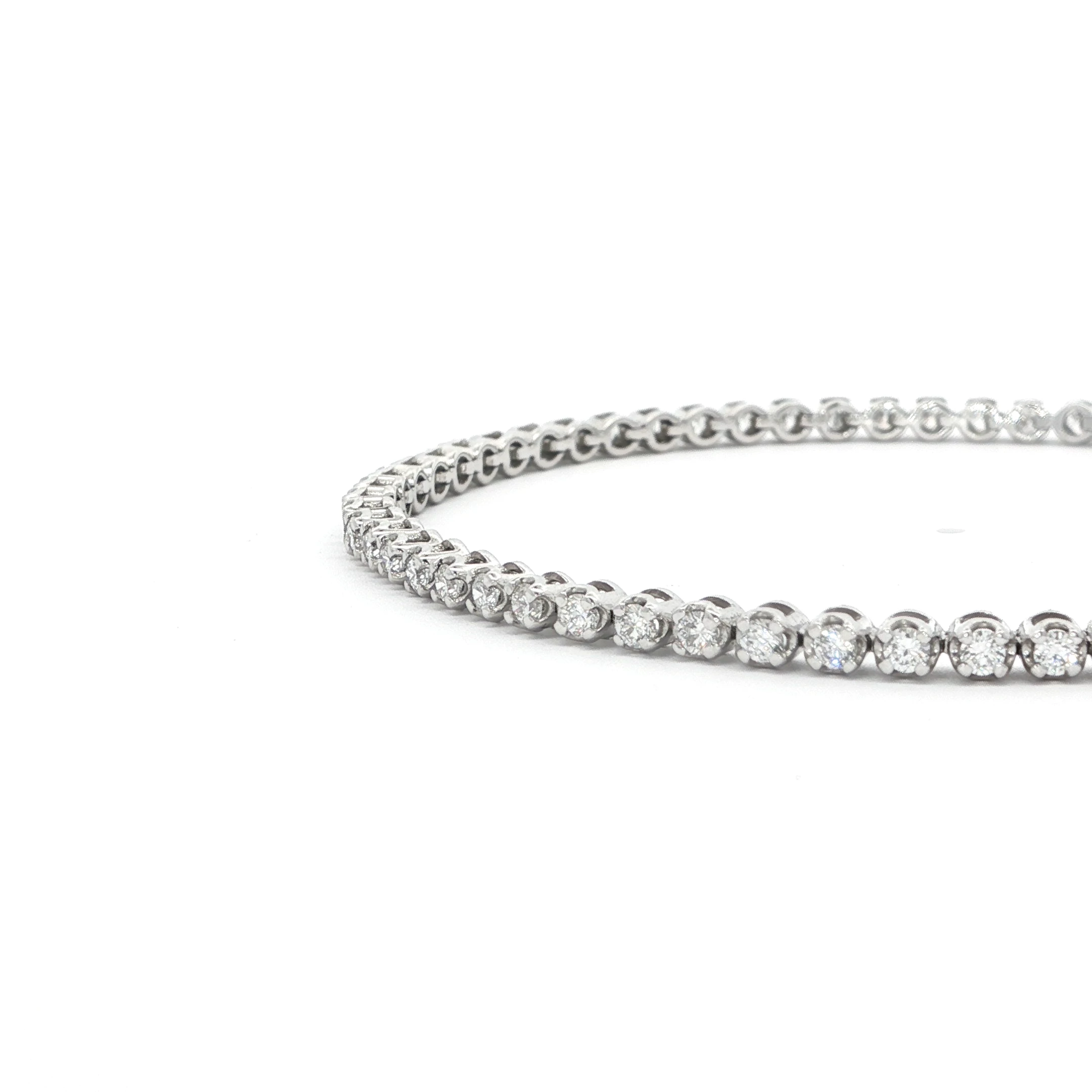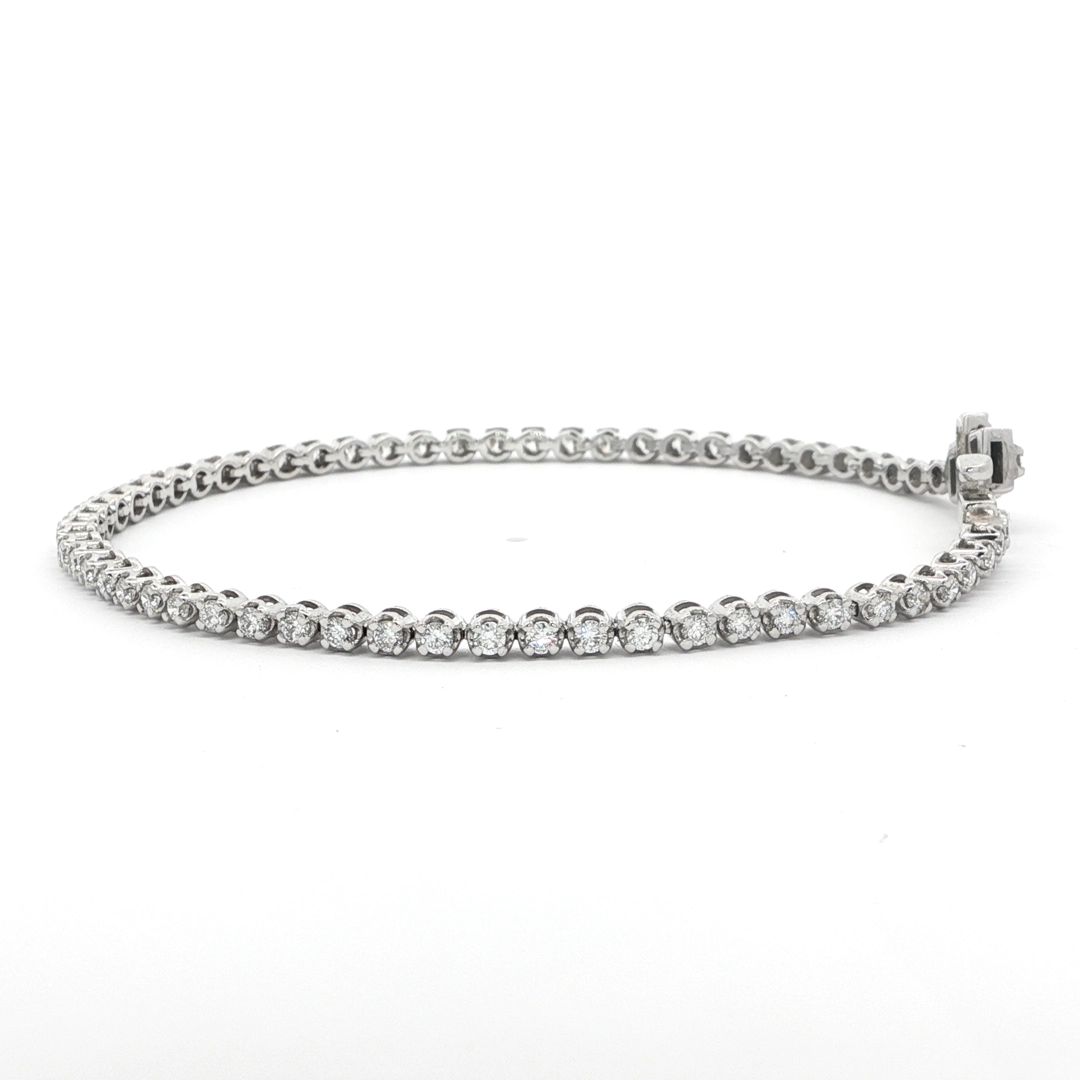 Exquisite tennis bracelet crafted in luminous 18k white gold. This timeless piece features 1.62 carats of round cut diamonds, each exhibiting brilliant sparkle and fire. A classic design that exudes sophistication, perfect for adding a touch of elegance to any occasion.