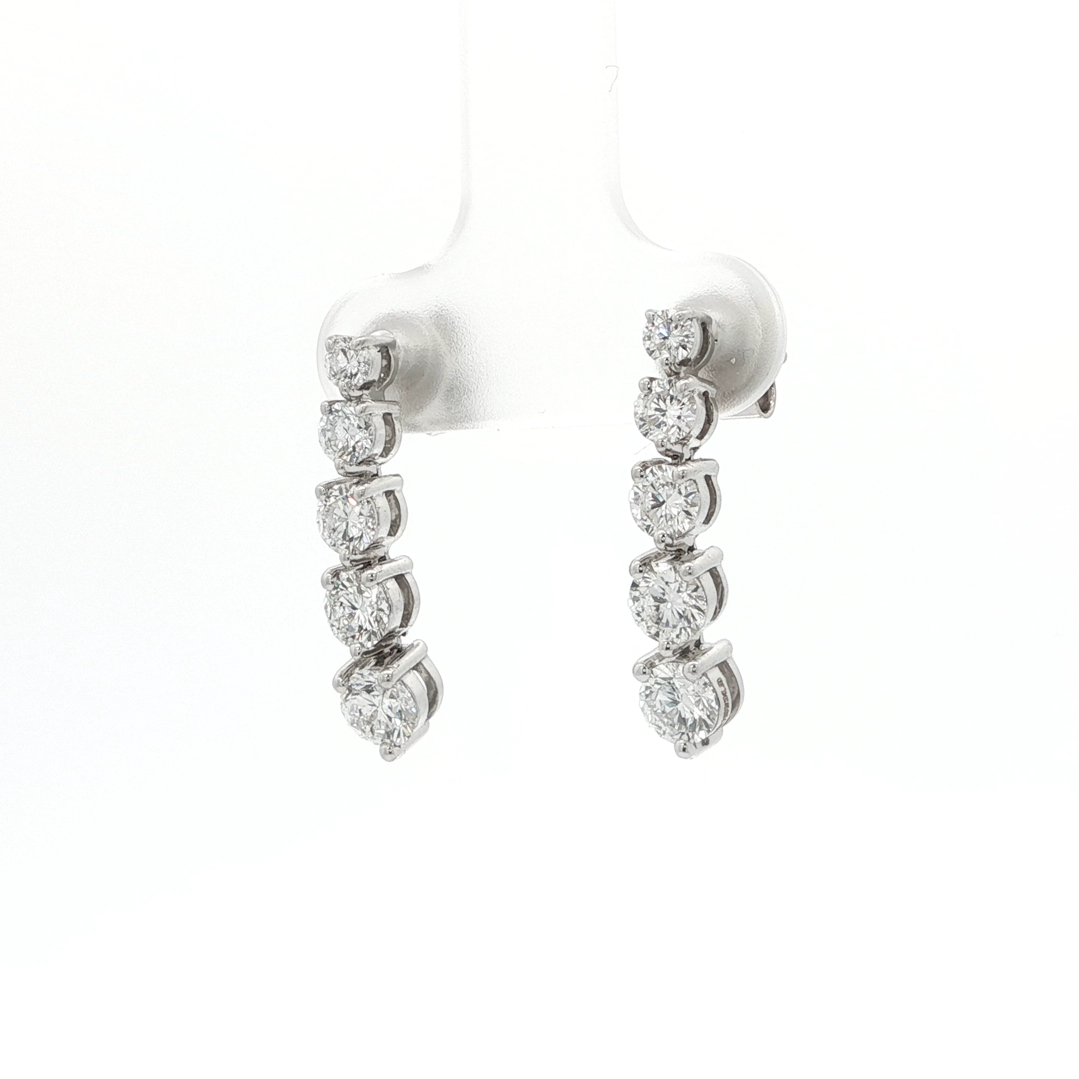 These exquisite dangle earrings are crafted in lustrous 18k white gold. Each earring features a cascade of round brilliant cut diamonds. The diamonds are meticulously set to maximize their brilliance and sparkle, creating a mesmerizing display of light. These elegant earrings are perfect for adding a touch of sophistication to any occasion.