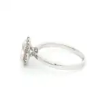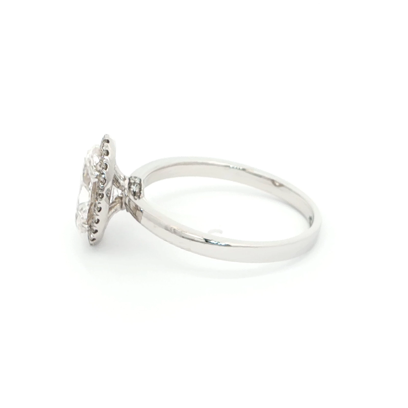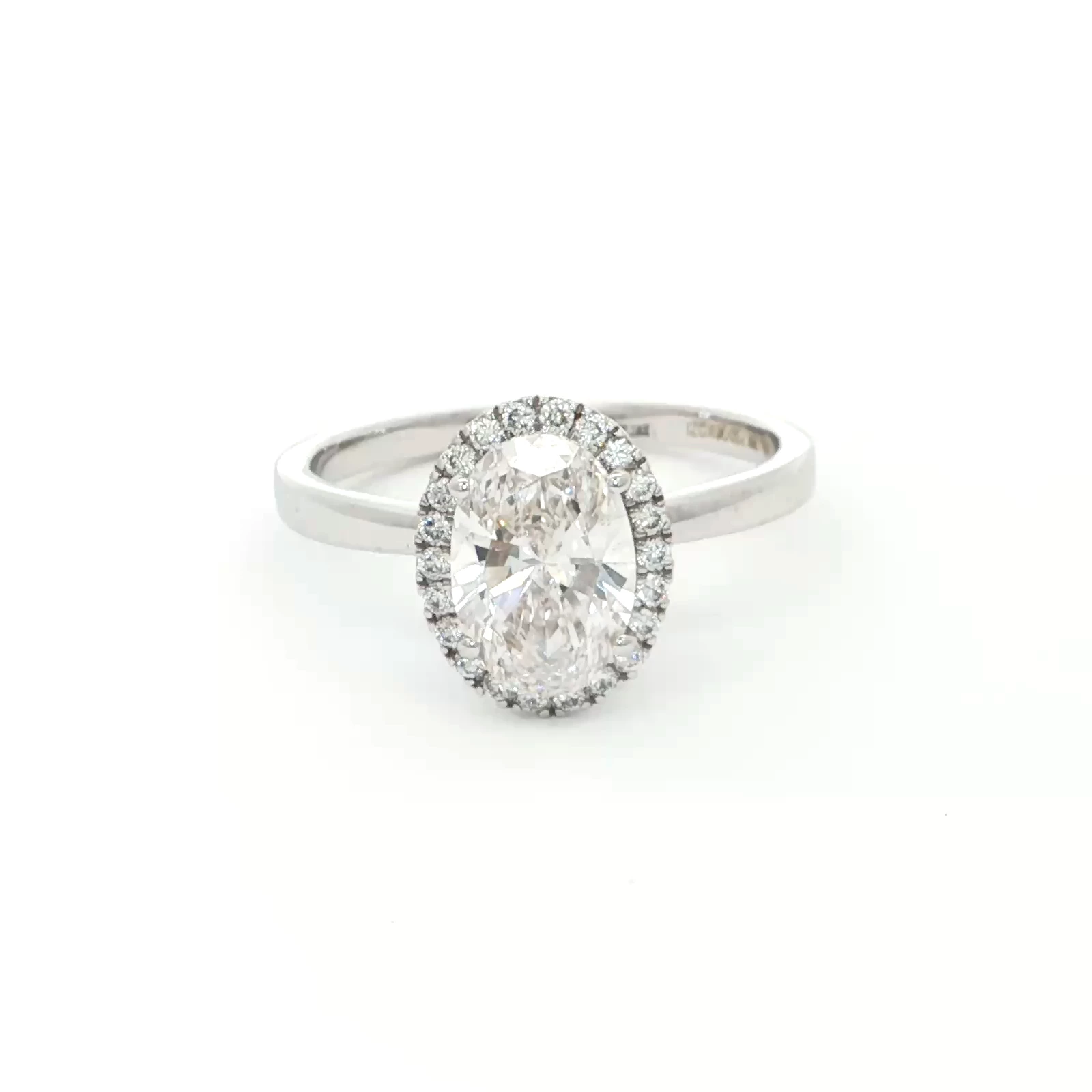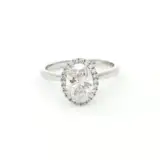Elegant 1.75 carat engagement ring featuring an oval shaped diamond, set in a refined 18k white gold band surrounded with a halo of smaller diamonds. The brilliant cut of the diamond enhances its sparkle, making it a timeless symbol of love and commitment.