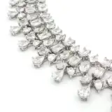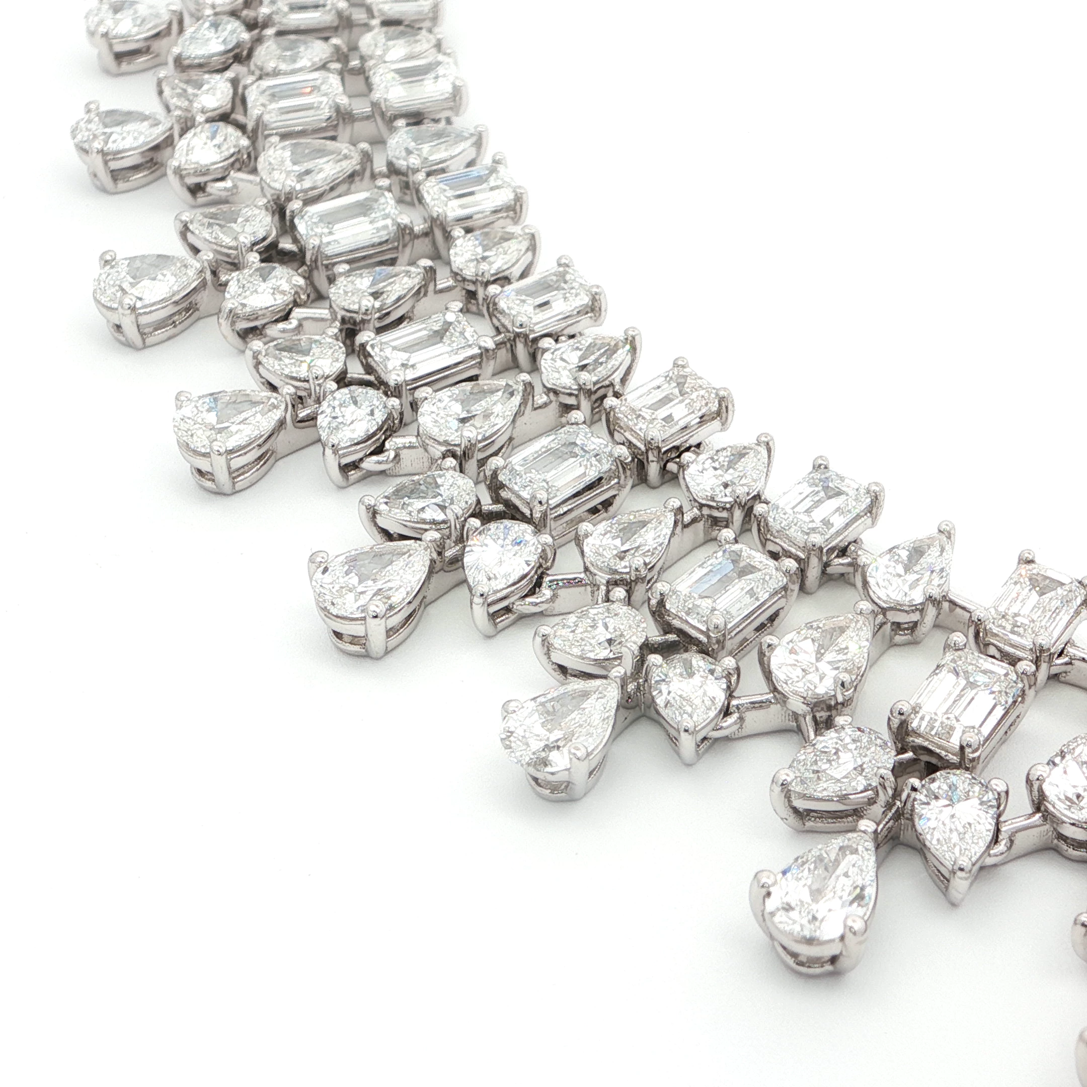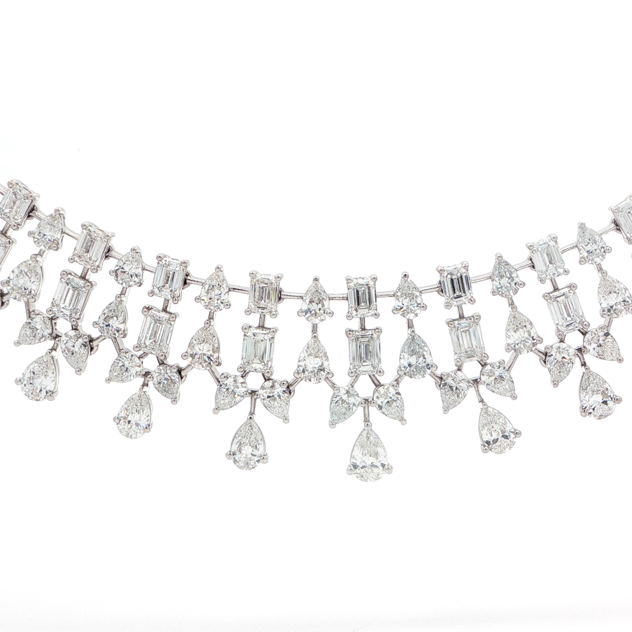 Dazzle in this exquisite lab grown diamond necklace. Showcasing a mesmerizing array of pear and emerald cut diamonds, each stone meticulously selected for its exceptional brilliance. The 18k white gold setting accentuates the colorless nature of these brilliant diamonds. A true statement piece, radiating sophistication and timeless appeal.
