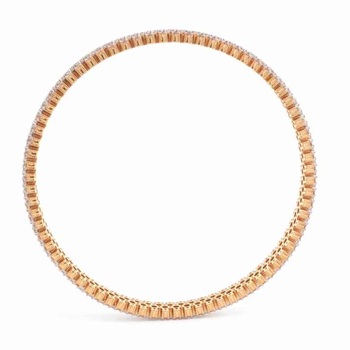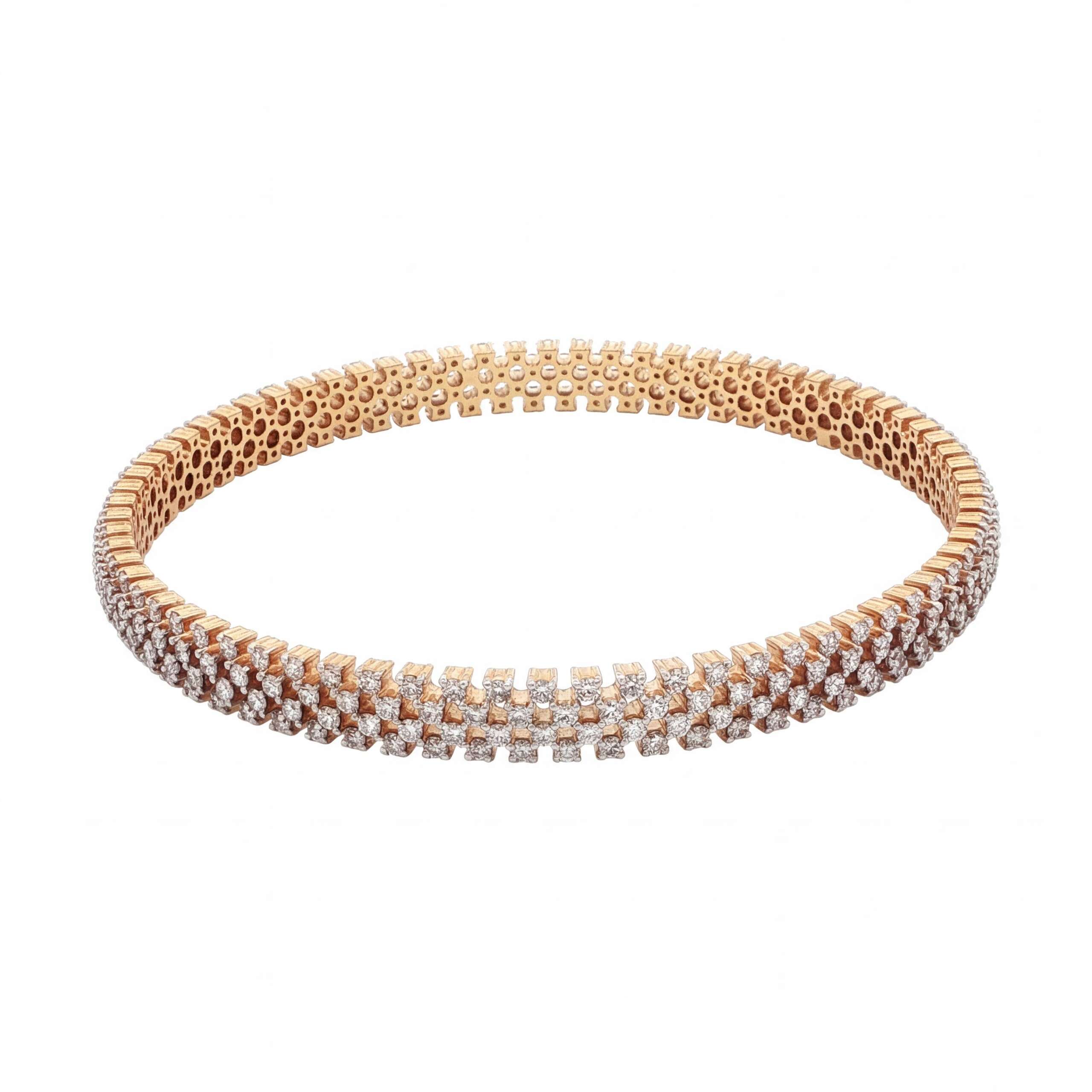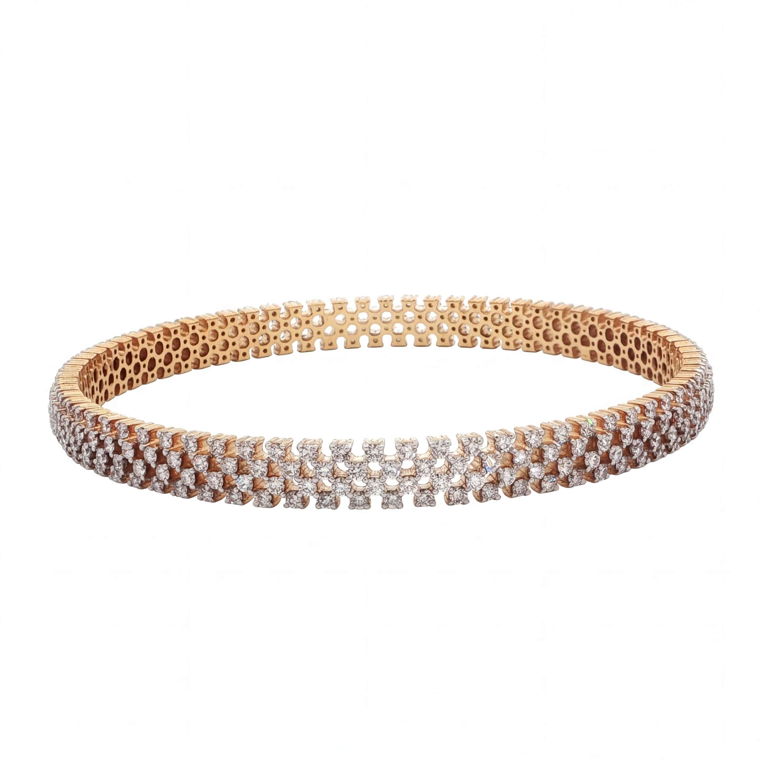 Embrace elegance with this exquisitely crafted bangle, fashioned from radiant 18k yellow gold. The design showcases a mesmerizing checker arrangement of round cut diamonds, each displaying brilliant sparkle. Meticulously set for optimal light dispersion, this luxurious bangle adds a touch of sophisticated glamour to any ensemble.