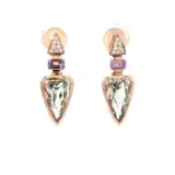 These elegant drop earrings feature 4.47 carats of geometric green amethysts and accent emerald shaped purple amethysts with natural diamonds. The earrings are crafted in 18k rose gold, offering a luxurious and refined aesthetic.
