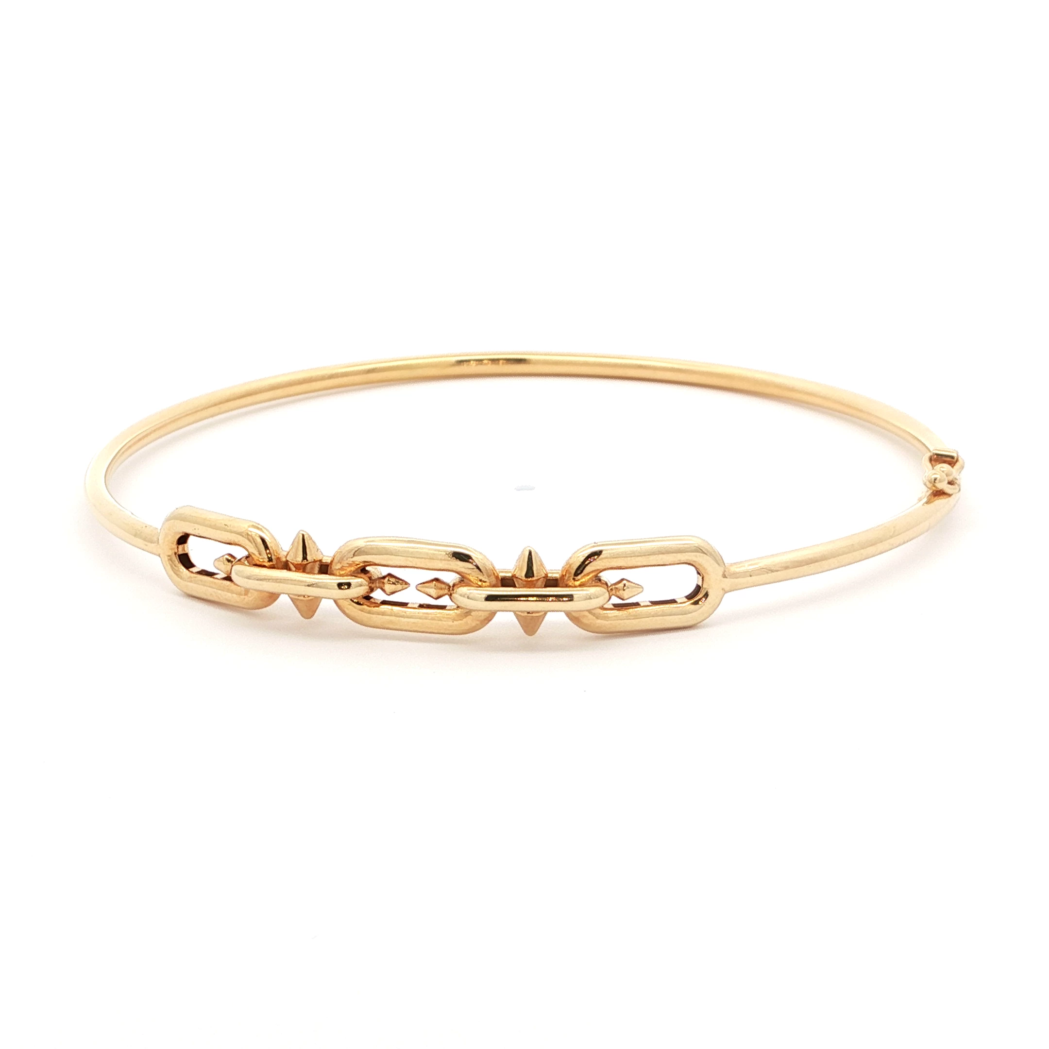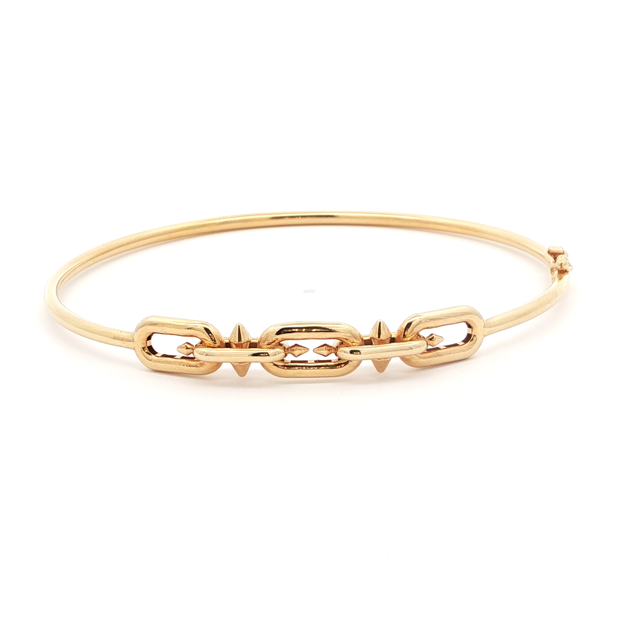Elevate your wrist with this chic bangle bracelet crafted in radiant 18k yellow gold. The streamlined design features a series of interconnected chain links, creating a modern and sophisticated statement piece. A perfect accessory for everyday elegance.
