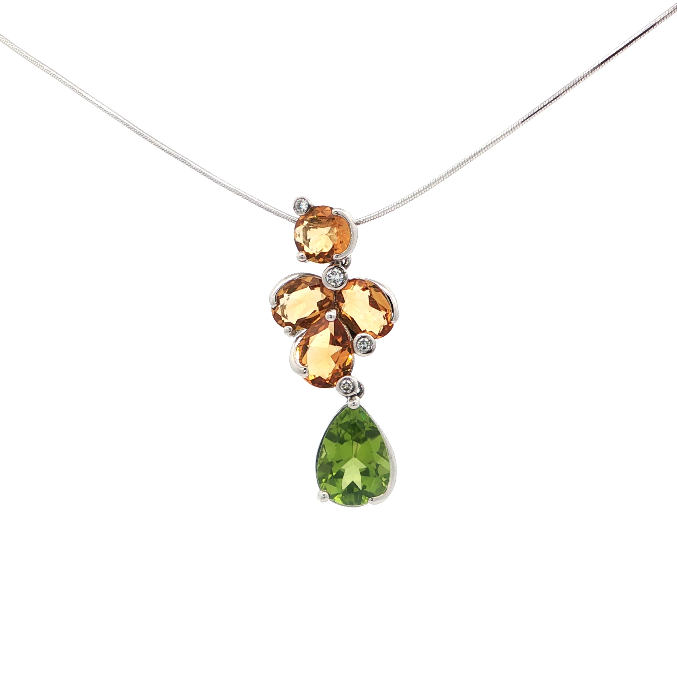 Adorn your neckline with this exquisite pendant, showcasing brilliant-cut, oval shaped citrines and a pear-shaped peridot gemstone, and fine natural diamonds to compliment the two gemstones. Crafted with high-quality 18k white gold, this pendant makes a captivating statement piece.