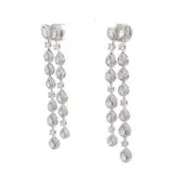 Elevate your ensemble with these sophisticated 3.86 carat long dangle earrings, crafted from lustrous 18k white gold. The design showcases brilliant pear and round shaped diamonds, meticulously set within halos of smaller diamonds to capture and reflect light with every movement. These earrings offer a refined sparkle, perfect for adding a touch of elegance to any occasion.