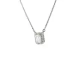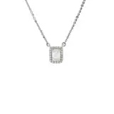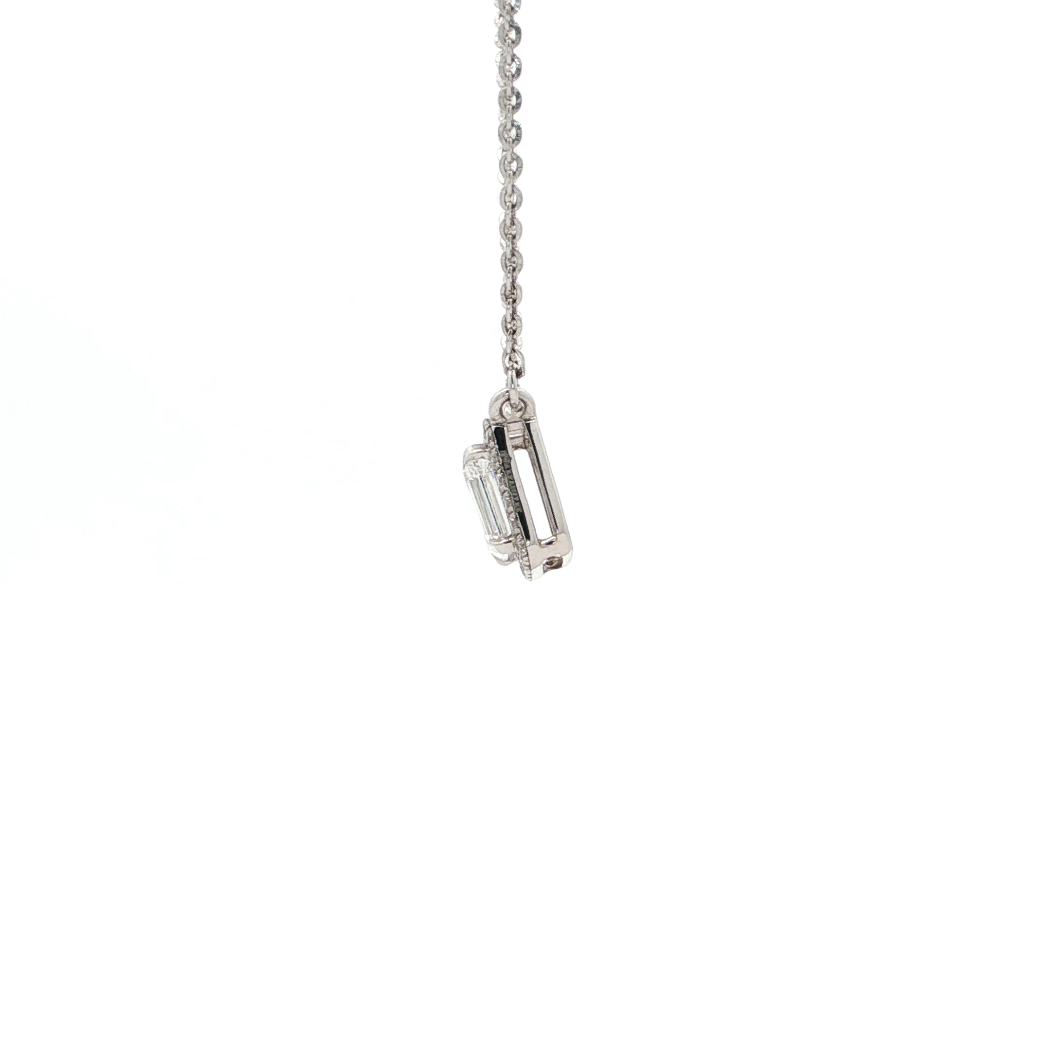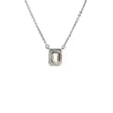 Elevate your elegance with this exquisite 18k white gold necklace. The pendant features an emerald cut diamond, surrounded by a halo of smaller diamonds. Its timeless design and delicate silver chain make it a perfect complement to any ensemble, adding a touch of refined sparkle.