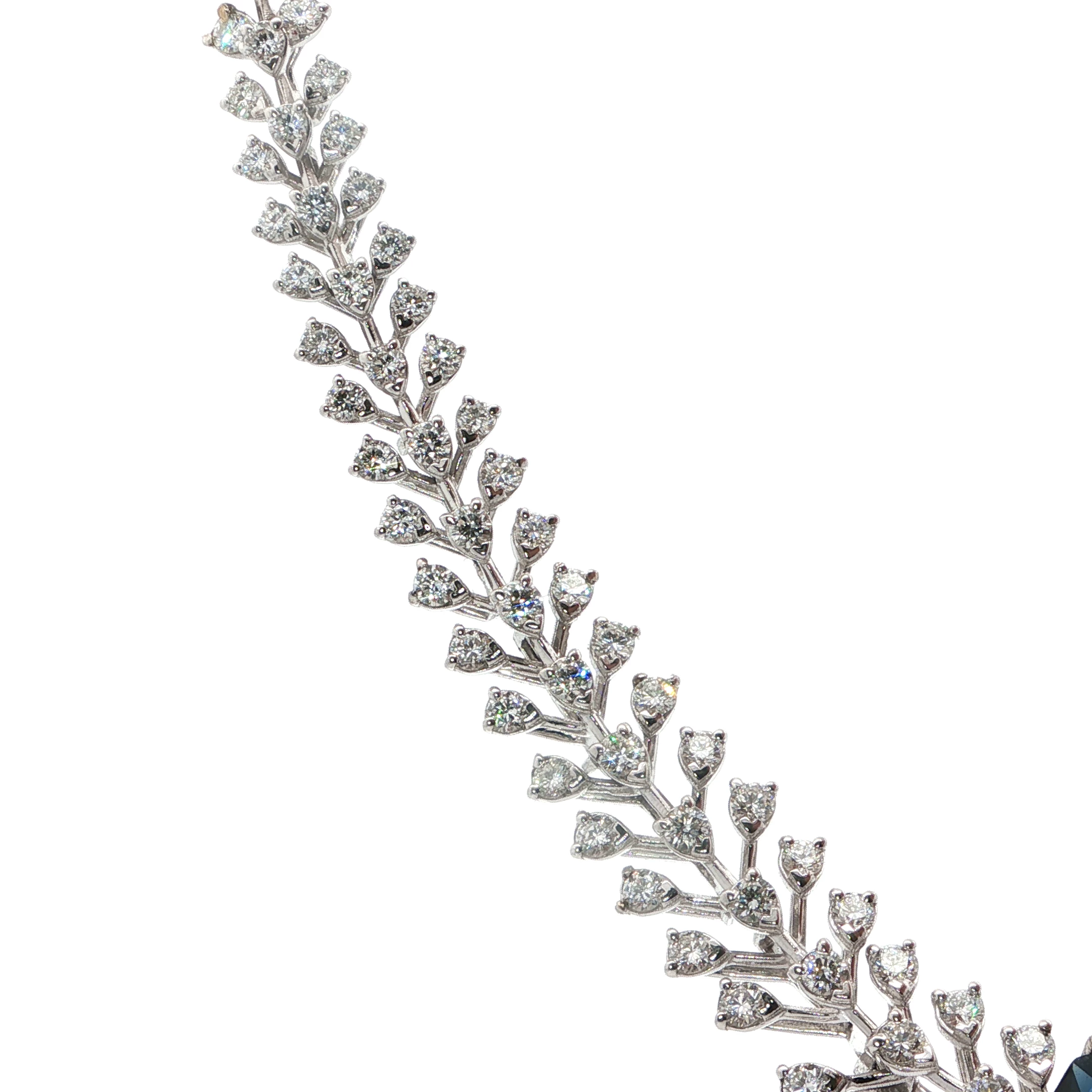 Indulge in the allure of this exquisite 18k white gold diamond necklace, graced with faceted blue accent stones. Meticulously crafted, the design showcases a harmonious floral arrangement, accentuating the diamonds’ brilliance and the blue stones’ captivating hue. This statement piece exudes sophistication, perfect for adding a touch of regal elegance to any ensemble.