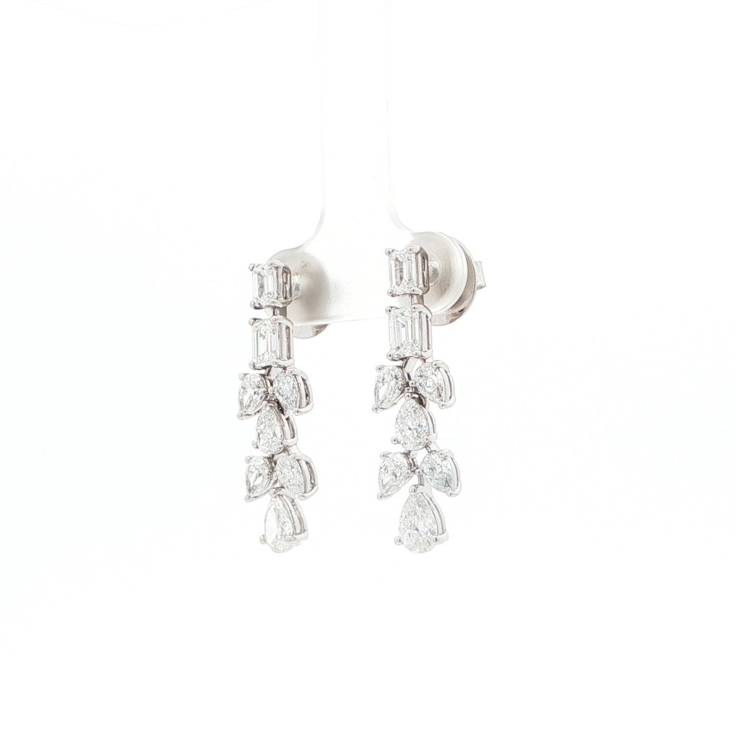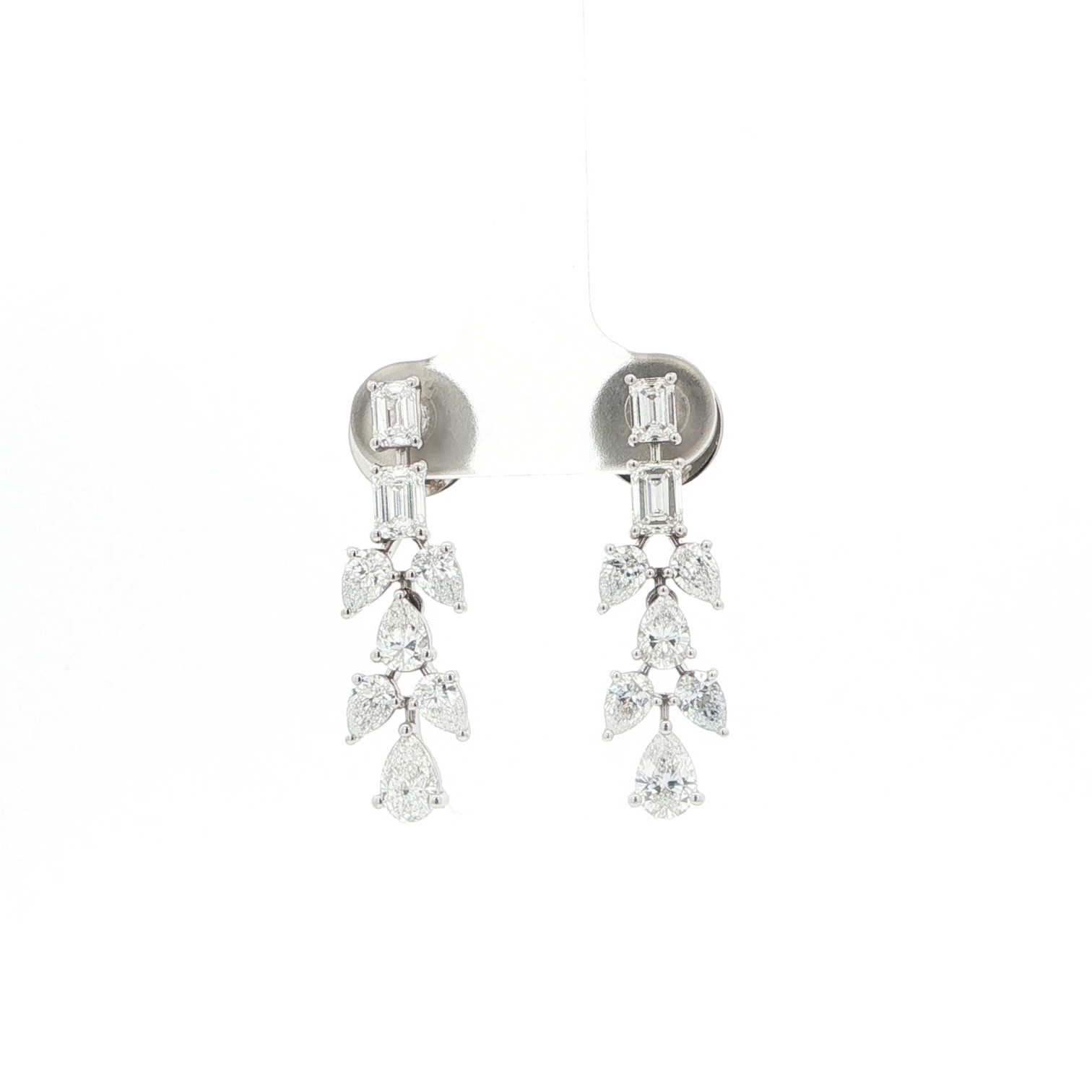 These elegant white gold drop earrings feature a vertical arrangement of emerald-cut and pear-brilliant diamonds. Each earring displays two step-cut emerald diamonds followed by a graceful cluster of pear-shaped diamonds in a tiered foliage motif. The high-polish finish enhances the excellent transparency and brilliance of the articulated drop design.