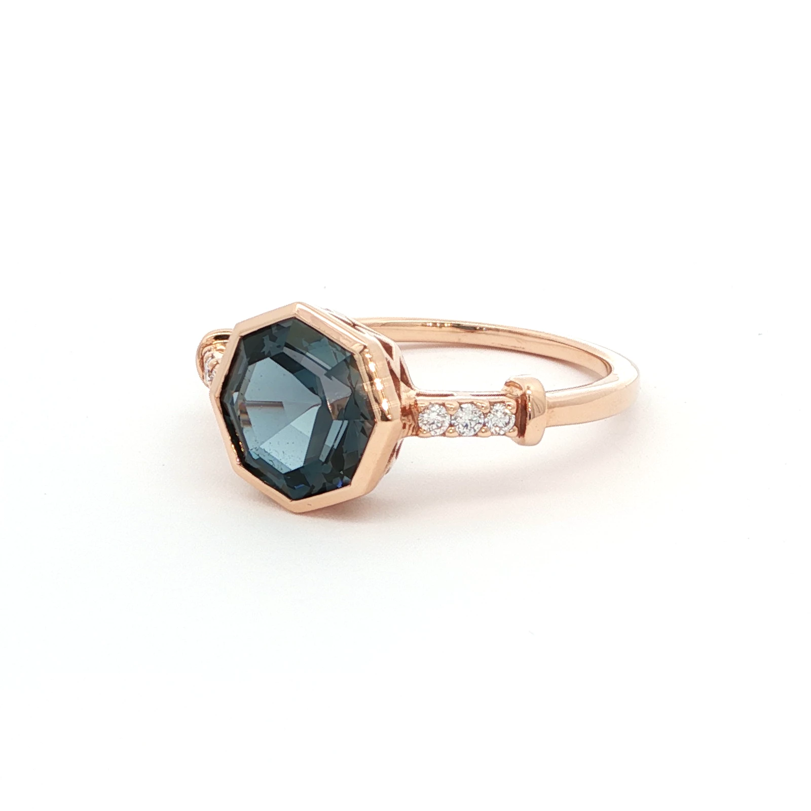 Exquisite cocktail ring featuring a 2.36 carat deep london blue topaz, showcasing an octagonal step cut for enhanced brilliance. Set in a delicate rose gold band studded with batural diamonds, this piece offers a unique blend of vintage charm and modern sophistication. The topaz’s vivid saturationare complemented by good polish and symmetry, making it a stunning statement piece.