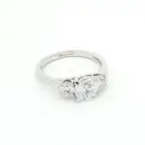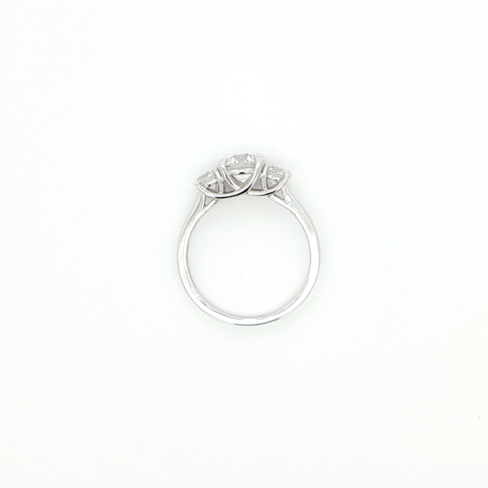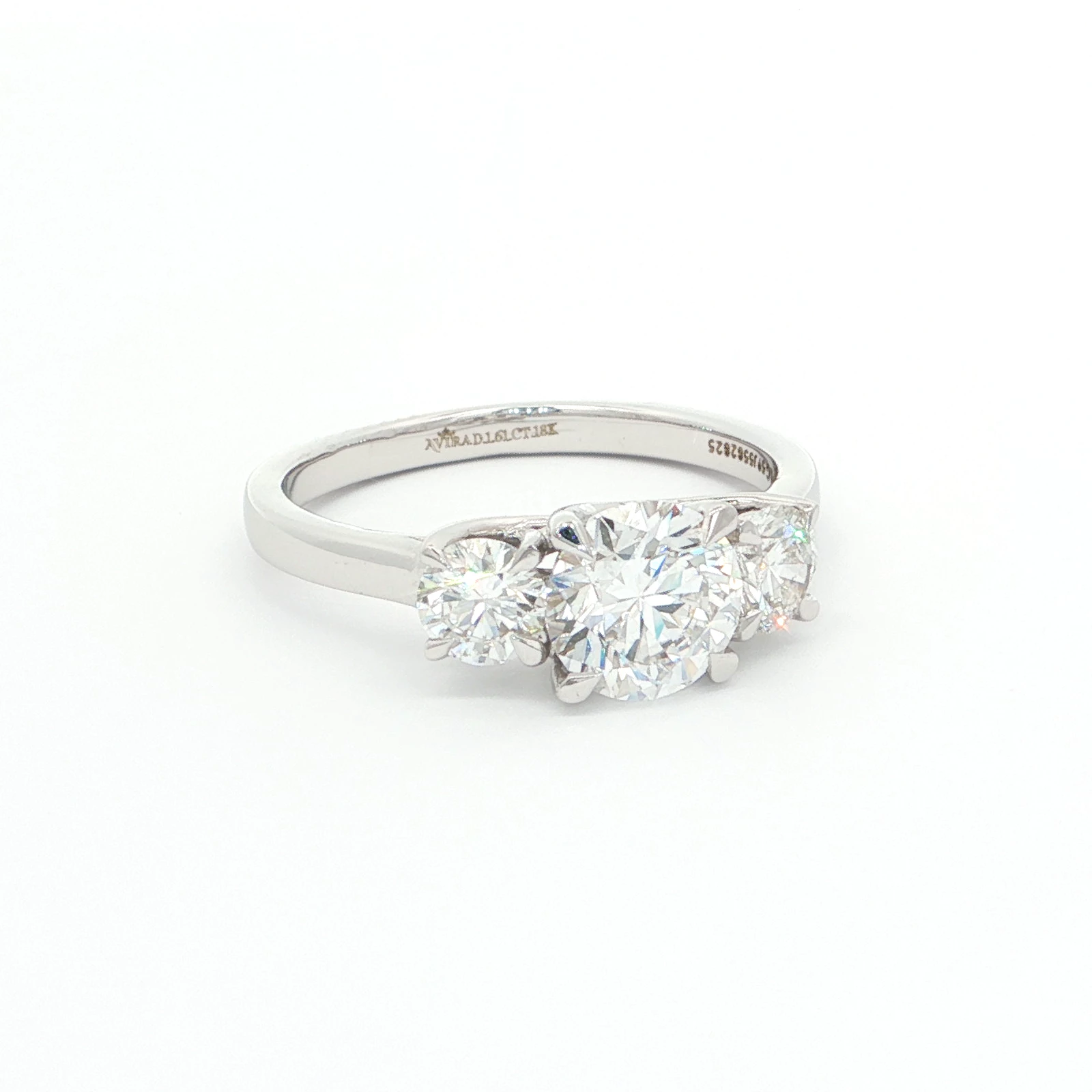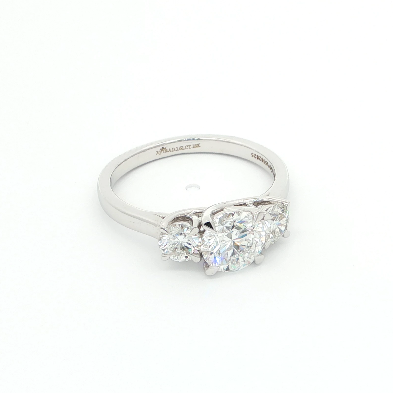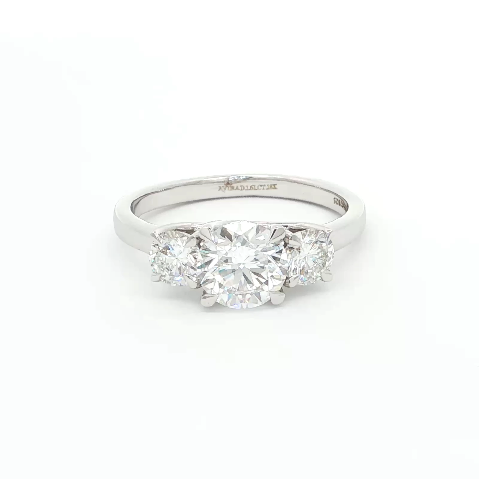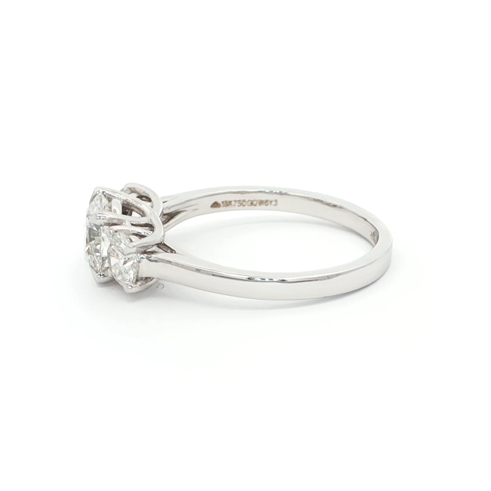Exquisite 1.61 carat trilogy ring featuring brilliant-cut diamonds set in a sleek 18k white gold band. This elegant design showcases a harmonious balance between classic sophistication and modern style, enhanced by the exceptional fire and brilliance of the diamonds. The impeccable craftsmanship ensures lasting beauty and timeless appeal.