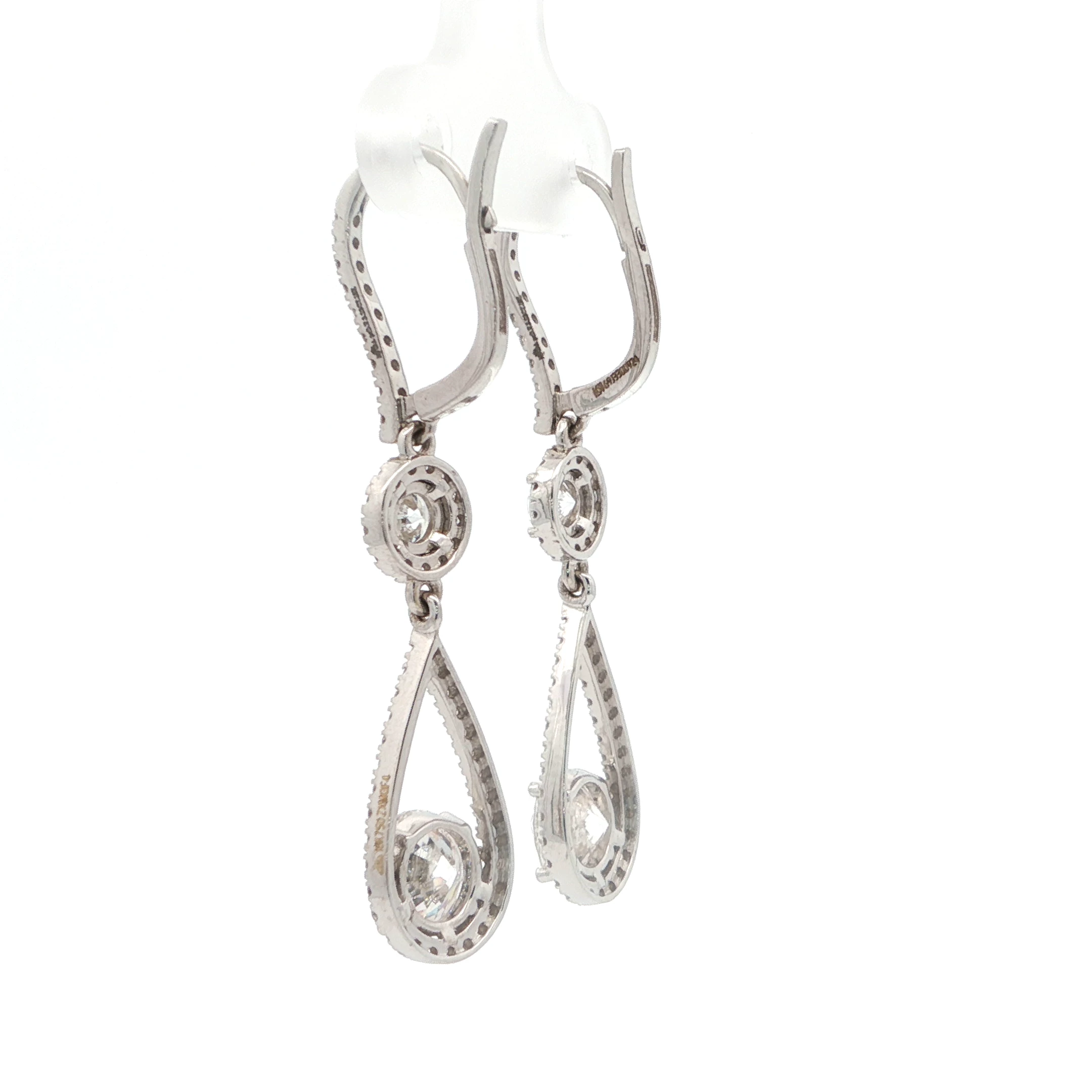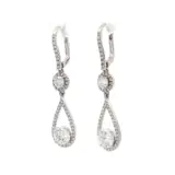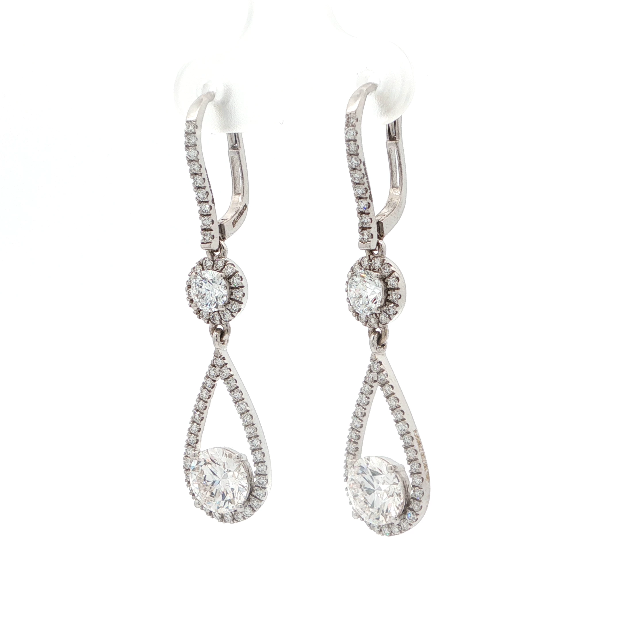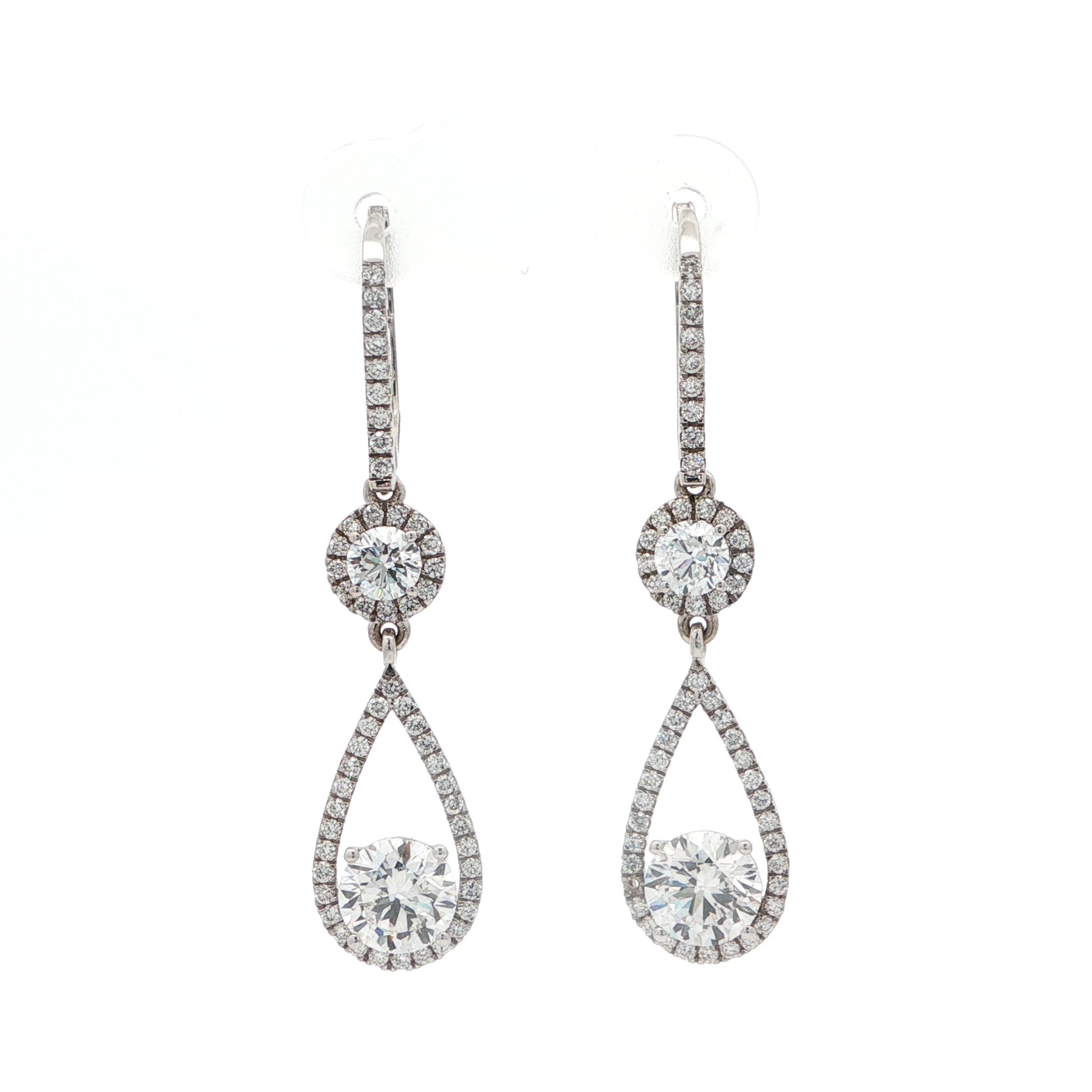 Embrace timeless elegance with these exquisite 18k white gold drop earrings. Featuring 3.23 carats of brilliant round cut diamonds, these earrings exude sophistication. The diamonds are meticulously set in a secure prong setting, offering maximum sparkle and fire. These captivating drop earrings are perfect for adding a touch of glamour to any occasion.
